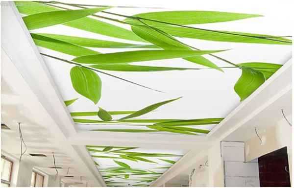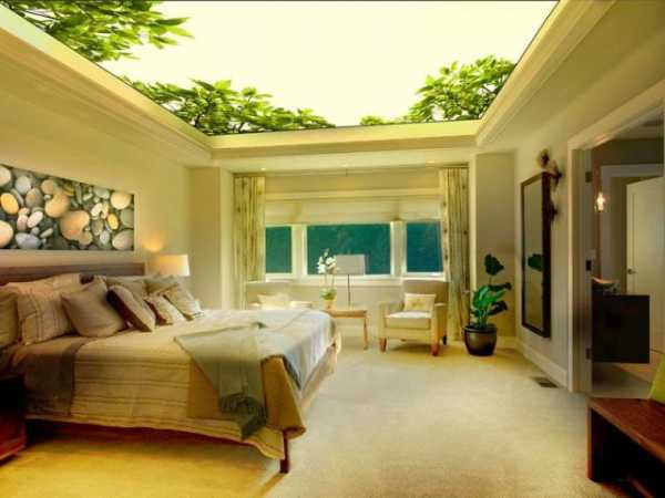 Так, в спальне с современным интерьером хорошо смотрятся двуцветные потолки или потолки, повторяющие некоторые тона интерьера. К примеру, зеленый пушистый ковер на полу будет отлично гармонировать с зеленой листвой на потолке фотопечатью.