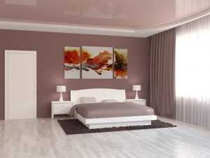 Глянцевые полотна отлично подойдут для использования в спальне. Однако, при нанесении на них фотопечати, картина изменится – далеко не всякое полотно можно будет применить в оформлении. Все дело в свете. Глянец очень хорошо отражает свет, а при определенном угле обзора, рисунки, нанесённые на полотно потолка, могут измениться визуально.