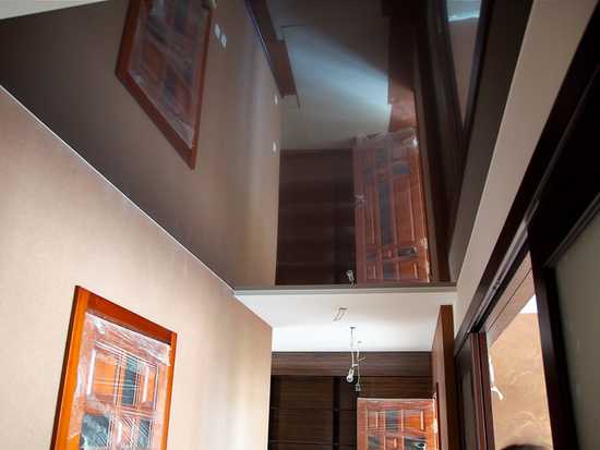 Глянцевое полотно в маленькой прихожей позволяет расширить доступное пространство, сделав комнату более высокой и светлой. А если вам необходим обратный эффект, что если потолки слишком высокие и от этого возникает чувство дискомфорта? Тогда нет ничего лучше матового полотна в темных тонах. Такое решение позволяет визуально уменьшить вертикальную удлиненность стен. Матовое полотно можно использовать при этом не только для создания одноуровневого потолка, но также и для двухуровневого.