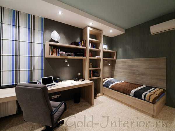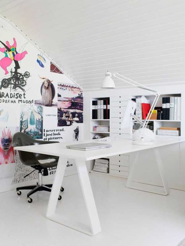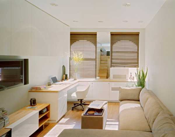 Лишняя площадь в квартире – непозволительная роскошь, поэтому чаще всего оборудуется миниатюрный рабочий уголок в гостиной комнате, который ограничивается угловым компьютерным столом, офисным креслом и несколькими книжными полками. Также возможен вариант раскладывающегося стола, а все рабочие аксессуары можно хранить в серванте или на подвесной полке. Сэкономить пространство поможет замена стационарного компьютера на ноутбук или планшет, а ксерокс, принтер и сканер можно заменить МФУ. Если не планируются ближайшие перестановки в комнате, рабочий угол визуально можно отделать декоративной штукатуркой, тонкостенным кирпичом или задекорировать фотообоями на самоклейке.
