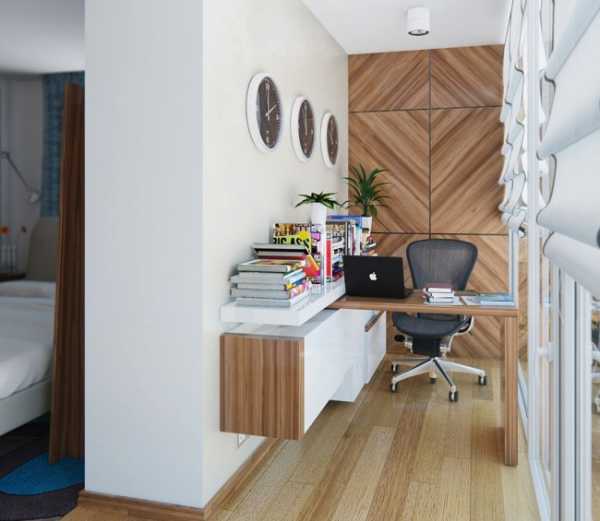 При достаточных габаритах балкона, можно обустроить в нем рабочую зону. Преимущества такого варианта очевидны: много солнечного света, замкнутая приватность, а при желании возможность обустройства маленькой оранжереи из домашних растений. Отделку можно сделать в светлых тонах либо под дерево или кирпич (обои, пластиковые панели, евровагонка, плитка и т.д.).