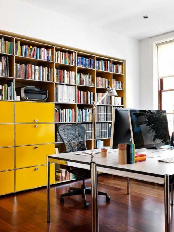Ярко-желтый фасад книжного шкафа в домашнем офисе на двоих