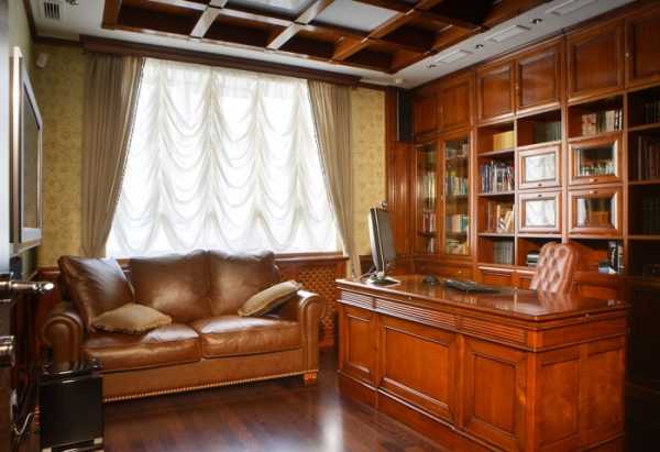 В своем классическом исполнении кабинет представляет собой массивный книжный шкаф, раритетный стол, деревянный стул с кожаными или текстильными вставками и множество антикварных вещей. От чернильницы с гусиным пером до старинного фолианта. В оттенках преобладают темно-вишневые цвета со светлыми тюлевыми гардинами и плотными шторами. Люстра может быть многоуровневой с хрустальными канделябрами с ниспадающим светом на благородных цветов ковер. Такой кабинет подойдет и для решения семейных советов, задушевных бесед и рождения, возможно, гениальных мыслей.