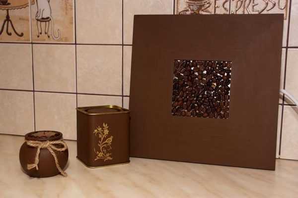 В качестве украшения кухни можно использовать настоящий кофе, сделав из цельных зёрен панно, украсить ими керамическую посуду или бутыль и даже просто насыпать их в большой прозрачный сосуд из стекла.
