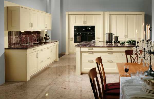 На пол кухни можно положить плитку из керамогранита ванильного цвета. Помимо того, что это покрытие отлично подходит для использования в кухонном помещении, легко чистится и не выгорает, светлые оттенки такого пола зрительно увеличат пространство кухни и сделают ее более воздушной.