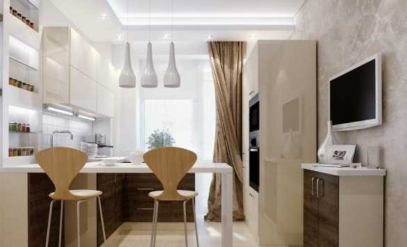 Глянцевая поверхность кофе с молоком помогает зрительно расширить пространство кухниУдачные сочетания