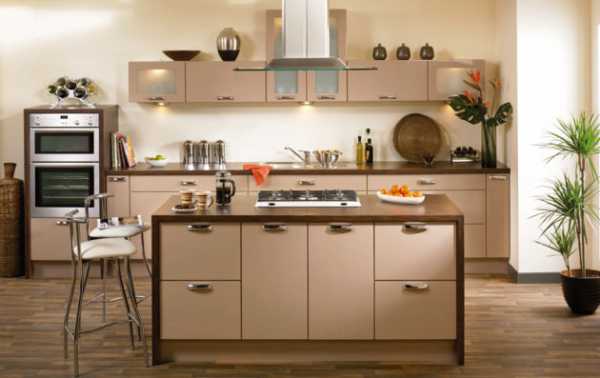 При подборе фона следует разве что учитывать размер помещения, помните большим площадям пойдут темные оттенки, в тон с ними смотрится светло-бежевая и молочная мебель. Такая гамма придает интерьеру изящности, притягивая внимание к обстановке. Маленьким кухонькам импонируют светло-коричневые стены, оттененные шоколадной мебелью. Подобное цветовое решение подойдет для оформления интерьера в стиле французского кафе, превратив ее в уютное бистро, где так приятно собираться с друзьями за чашечкой ароматного кофе.