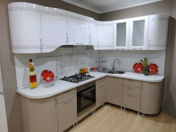 Материалы для таких гарнитуров могут быть разные: МДФ, ДСП, ЛДСП, а так же кухни их пластика с глянцем и без.