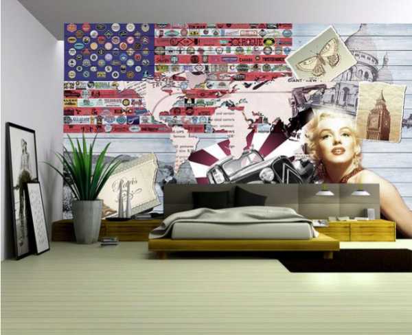 Интересным решением станет отделка разных стен комнаты монохромными обоями разных цветов. И, конечно, для стиля поп-арт прекрасно подойдут фотообои в виде повторяющейся ленты с портретами Мэрилин Монро, Элвиса или Че Гевары в разном цветовом наборе. Обои могут с успехом заменить коллажи из газет, но лучше мелованная бумага светских журналов. Шкаф-купе тоже можно покрыть обоями. Так он будет смотреться как ниша в стене, а не как встроенная крупногабаритная мебель.
