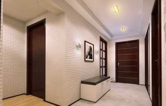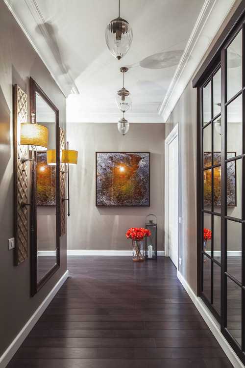 Если же цвет слишком темный — венге, например, то придется его обыгрывать плинтусом и/или декоративными элементами, а стены в таком коридоре однозначно лучше светлые: на их фоне темные дверные проемы смотрятся как украшение.