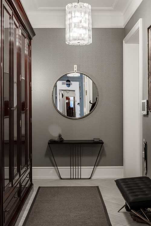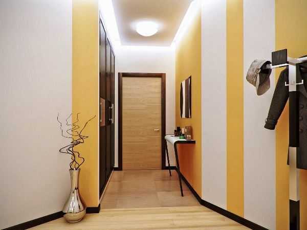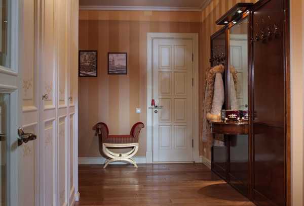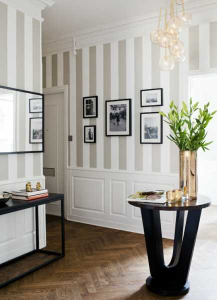 Даже небольшие коридоры выполняют важную миссию, они необходимы для размещения верхней одежды и уличной обуви. Для того чтобы коридор не выделялся на фоне остальных помещений квартиры, важно серьезно относиться к подбору обоев. На фото – полосатые обои в коридоре городской квартиры.