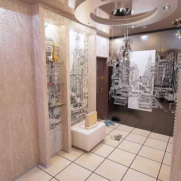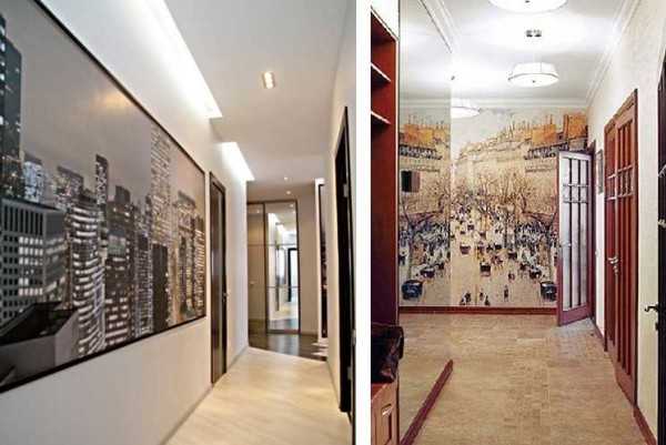 Современные технологии позволяют переносить на бумагу любые изображения. С появлением широкоформатной фотопечати высокого качества появлялась возможность не собирать изображение из кусочков, а клеить сплошным полотном. Это смотрится намного лучше. Используются фотообои и в коридоре.