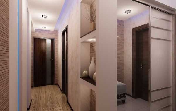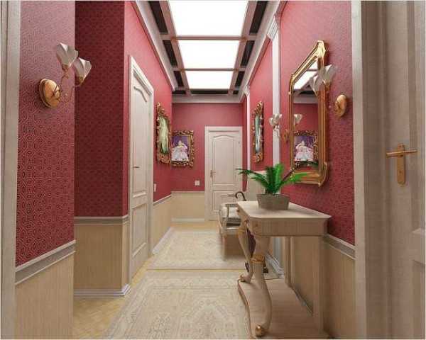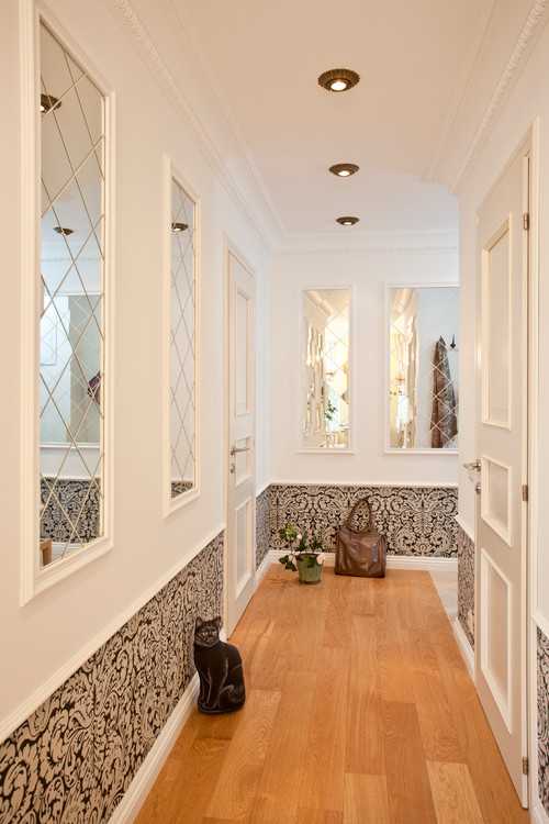Вообще, узкие коридоры — это отдельный разговор. При помощи некоторых уловок можно добиться эффекта расширения пространства. Например, при достаточной высоте потолков, в узком коридоре примерно посередине стены можно сделать полосу другого цвета. Этот прием позволяет «развалить» стены в стороны. Эффект увеличивается, если на противоположной стене есть большое зеркало или зеркальные дверцы шкафа.