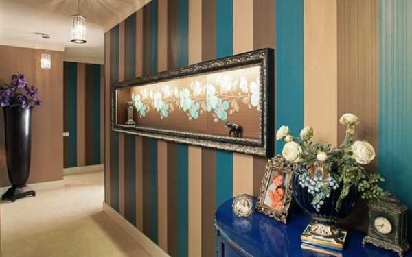 Можно использовать в узком коридоре обои в полоску. Но искать нужно широкие полосы. Узкие создадут эффект пестроты. Если такие не найдены, можно скомбинировать два цвета одного типа (о таблицах сочетаемости цветов в интерьере читаем тут). Если потолки высокие, можно располагать полосы горизонтально, если нет — вертикально.