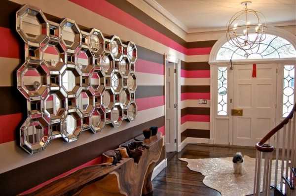 Однотонные темные полотна сделают прихожую мрачной, ведь в данном помещении недостаточно естественного солнечного света. Обои в горизонтальную полоску для узкого коридора трудно считать оптимальным вариантов выбора. На фото представлено интересное решение для декорирования прихожей городской квартиры.