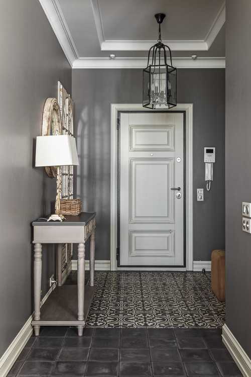 Чем темнее оттенок обоев, тем ярче смотрится белоснежный декор. Сделать прихожую еще менее скучной поможет красивый плиточный пол — в тон обоям (или наоборот).