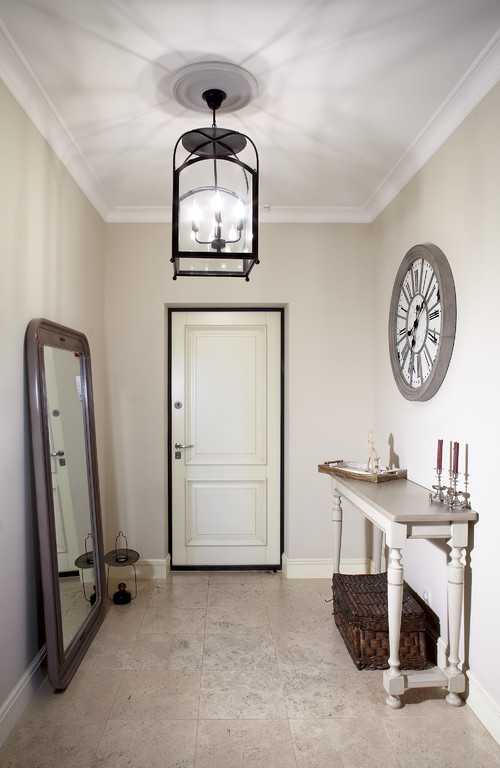 Холл или коридор в таком интерьерном стиле должен быть светлым. Необязательно клеить на стены белые шпалеры в «цветочек», можно выбирать серые отделочные материалы, имеющие незначительный растительный узор. В этот интерьерный стиль гармонично вписываются полосатые обои, например, можно поклеить коридор шпалерами с серо-белыми вертикальными полосками. Для французского прованса характерны пастельные светлые оттенки.