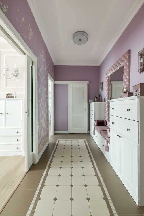 Часто интерьерные дизайнеры при оформлении коридоров в подобном интерьерном стиле, стараются выделять отдельную зону. Она предназначена для размещения грязной обуви, учитывая, что подобный участок прихожей всегда будет накапливать максимальное количество грязи и пыли, нижнюю часть стены декорируют полимерными материалами либо приклеивают плитку поверх обоев. Подобный вариант не просто имеет высокую практичность, но и естественным образом дополняет нежный прованский интерьер.