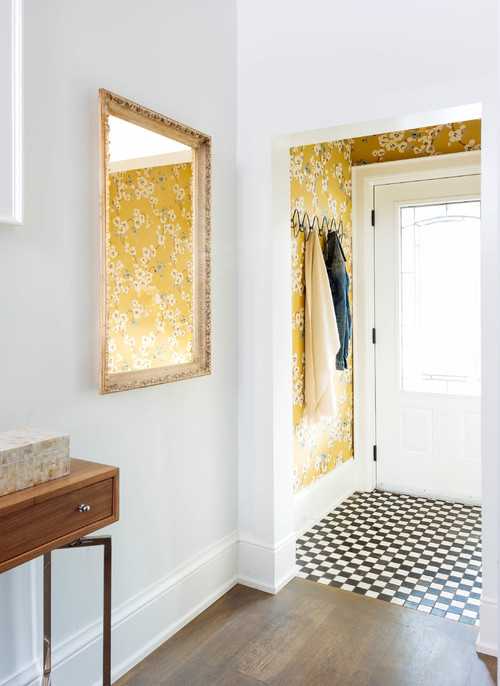 Комбинируя яркие принты и однотонные участки, можно управлять вниманием зрителя, развлекая его контрастами и нетривиальными решениями. Ярко-желтая прихожая настраивает на веселый лад.