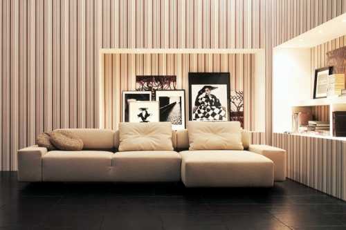 - В случае выбора «полосатых» обоев, необходимо обращать внимание на ширину полосы. Чтобы оттянуть внимание от стен, можно прибегнуть к чередованию узких и широких полос, что позволит сделать интерьер более спокойным. При этом важно помнить, что при использовании обоев с вертикально ориентированными полосами высота потолков визуально увеличивается, а при использовании горизонтальных полос – пространство помещения зрительно расширяется;