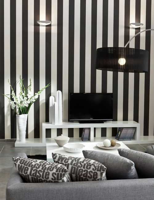 Полосы подходят любому стилю. Вертикальные зоны делают потолок выше, а объем комнаты – меньше.