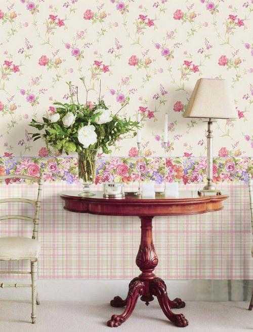 Самым сложным является сочетание обоев с различного рода цветочками. Здесь уже требуется безупречное чувство вкуса. Без дизайнерского образования лучше к таким комбинациям самостоятельно не прибегать. Хотя и здесь действует правило переклички цветов. Такое сочетание характерно для интерьеров английском стиле. Буйство цветов располагается на обоях, креслах, шторах и соседствует с клеткой и полоской.