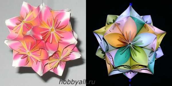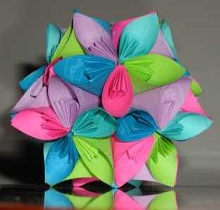 Интересной разновидностью модульного оригами является техника «кусудама», о которой мы обязаны вспомнить. Особенность ее в том, что изделие создается из бумажных конусовидных или шарообразных фигур. Количество их регулирует мастер, в зависимости от сложности и объемности готового изделия. Большинство оригамистов говорят, что кусудама — абсолютно другая техника. Так как элементы фигур сшиваются. Тот, кто освоит эту технику, сможет создавать настоящие цветочные шедевры и украшать ими свой дом.