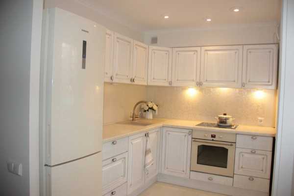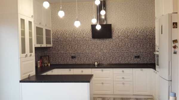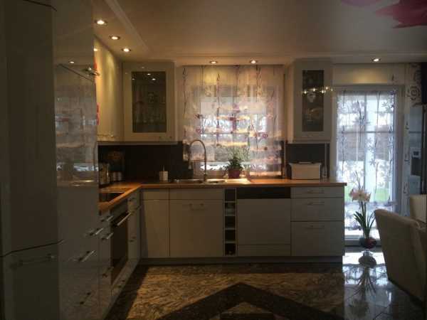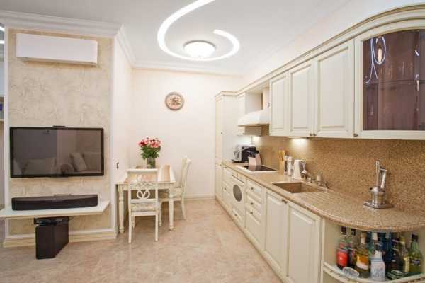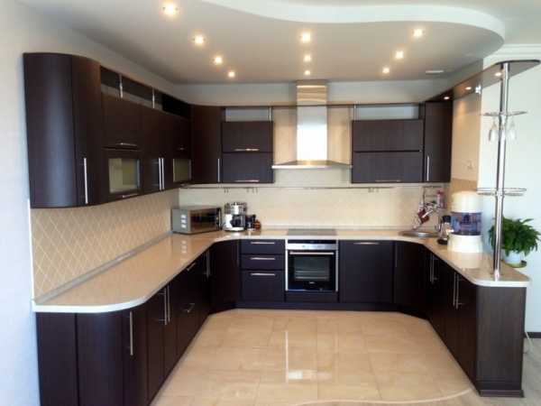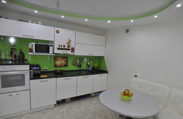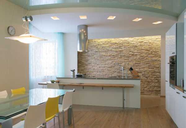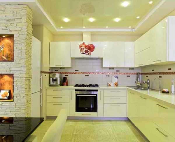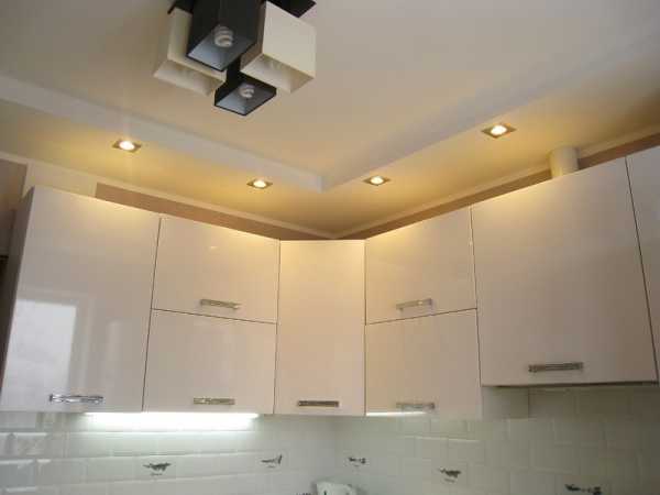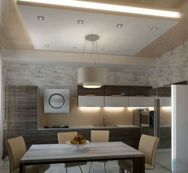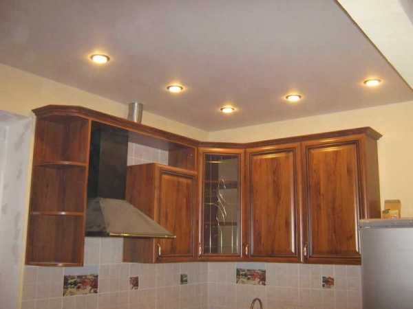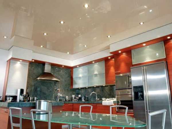 Каждый из вариантов заслуживает внимания и может быть использован. Однако, ограничиваться лишь перечисленными схемами не стоит, так как каждое помещение оформляется индивидуально и может потребовать собственного решения. Чтобы получить примерное представление о самых популярных схемах размещения софитов, ниже приведено несколько фото примеров того, как можно расположить светильники, если ваша кухня имеет такую отделку перекрытий, как натяжные потолки.
