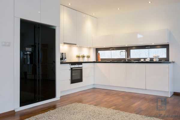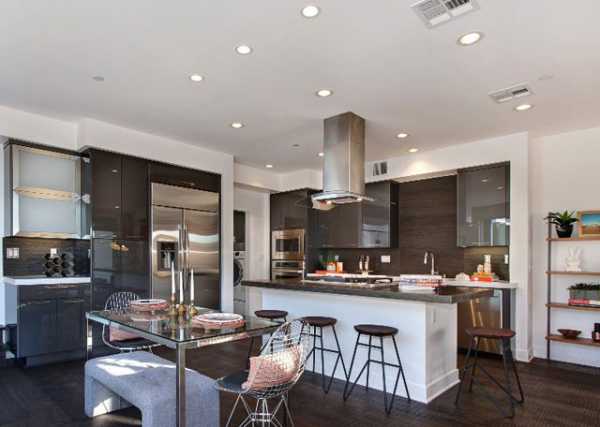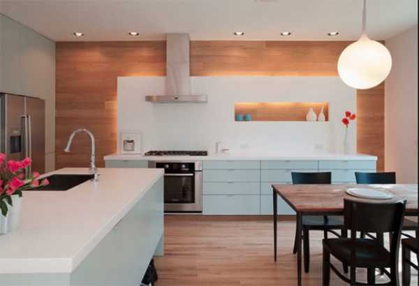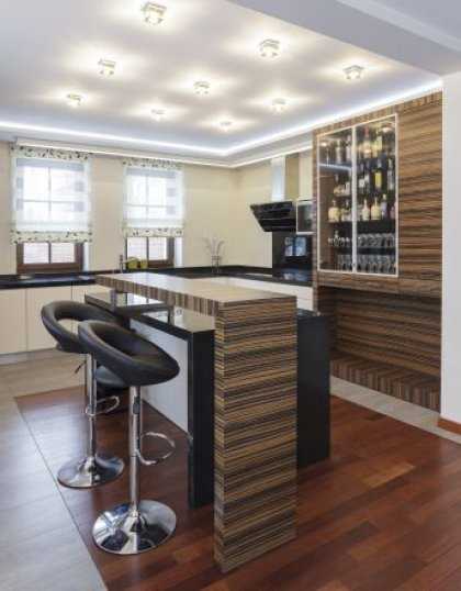 - Осветив рабочую плоскость встроенными спотами, необходимо позаботиться и об освещении остального пространства.
