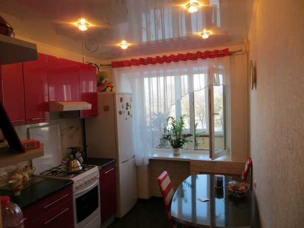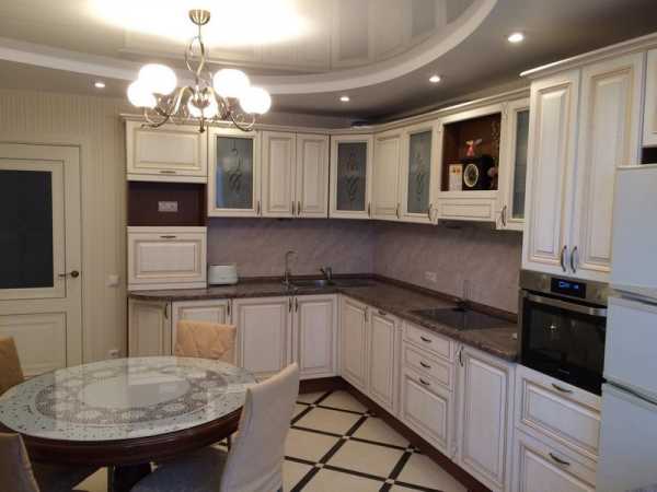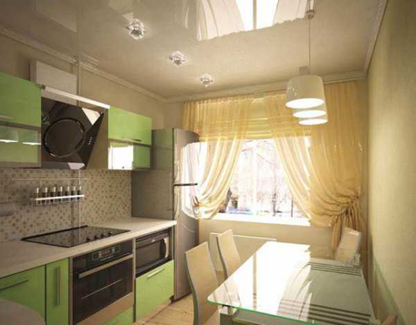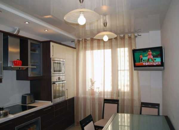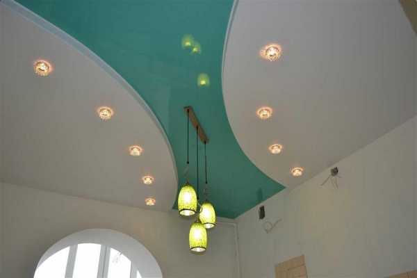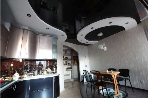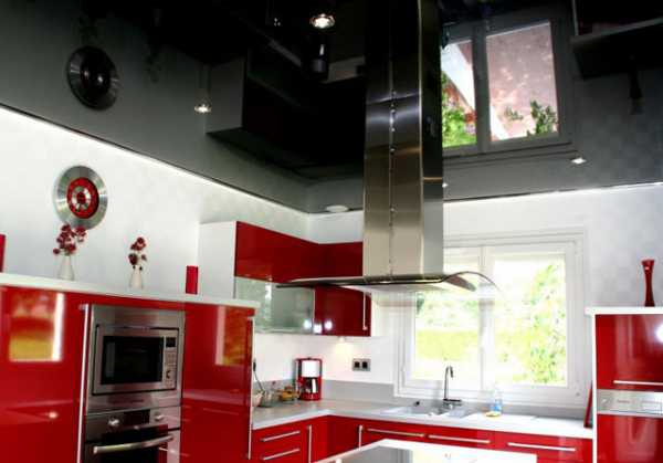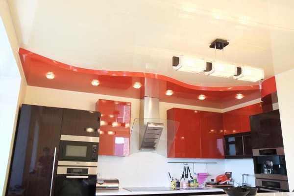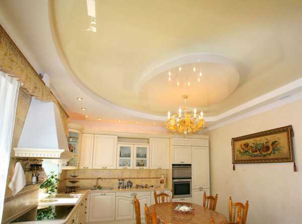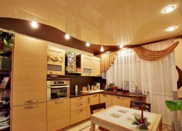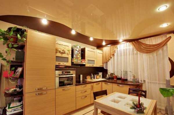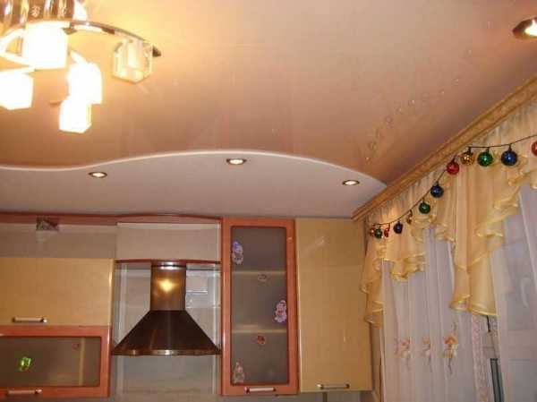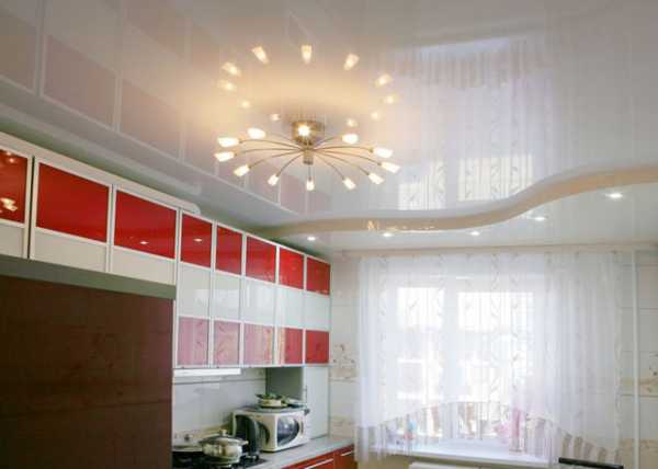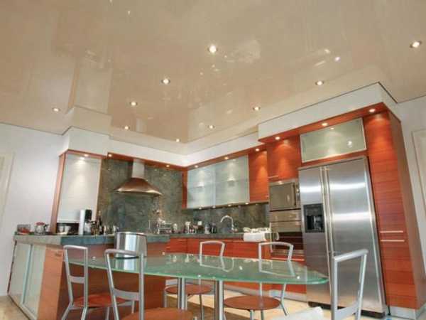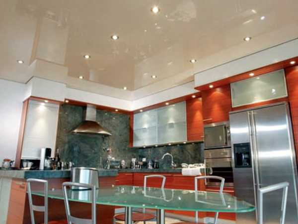 Натяжной потолок – конструкция, которая предполагает разные виды светильников, от неприметных точечных до больших люстр в разных стилях. Выбирайте тот светильник, что «подружится» и с гарнитуром, и с текстилем кухни, и с вашими эстетическими предпочтениями.
