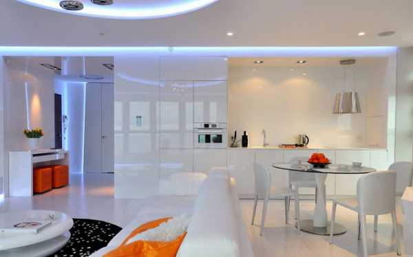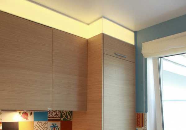 Светодиодная подсветка потолка на кухне бывает белой, желтой, цветной и мигающей. Она отличается многообразием и универсальностью. Светодиодные ленты пользуются огромной популярностью. Устройство специального короба для монтажа делает их эксплуатацию безопасной.