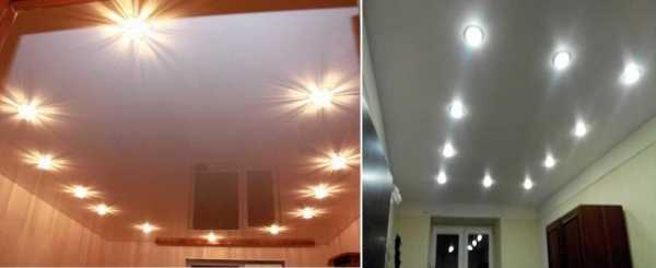 Когда натяжной потолок изготовлен из двух свариваемых между собой полотен, точечные лампы нужно располагать на расстоянии не менее 15 сантиметров от шва.