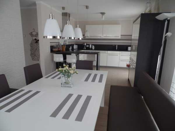 - Отдельное освещение обеденной части подвесной люстрой или встроенными софитами с рассеянным светом и точечный свет над рабочей поверхностью.