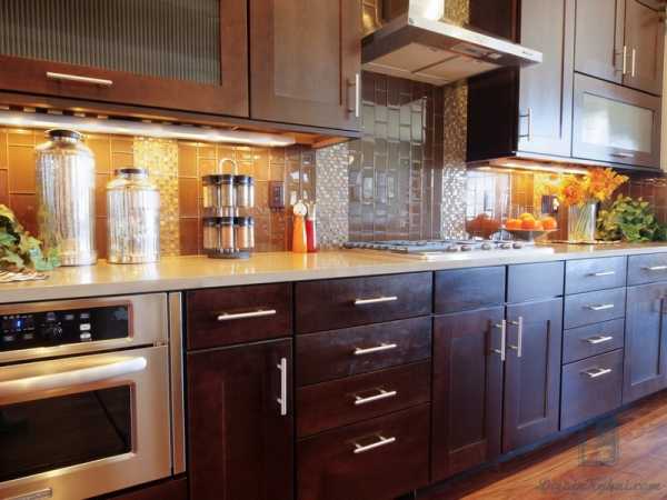 Если кухня традиционного типа, рабочая зона находится под навесными шкафами, то светильники размещаются на днище шкафчиков.