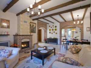 Возможно комбинирование вариантов. Напольное покрытие – традиционно деревянное. На потолке – простая штукатурка стандартного белого цвета или настоящие деревянные балки. Цветовое решение внутренней отделки загородного коттеджа – из натурального спектра. В центральной комнате стоит обустроить камин.