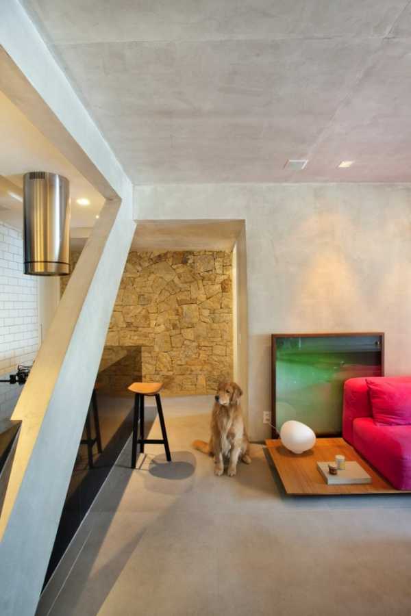 Использование декоративного камня в интерьере гостиной двухуровневой квартиры
