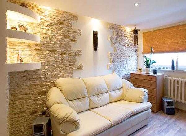 Выложенные своими руками искусственным камнем ниши или полочки в однокомнатной квартире, станут отличным решением для прихожей или гостиной. Эти элементы интерьера, снабженные хорошим направленным освещением, станут отличным местом для хранения предметов гордости семьи: дипломов, наград, а также сувениров, ваз с цветами, скульптур и другого декора помельче.