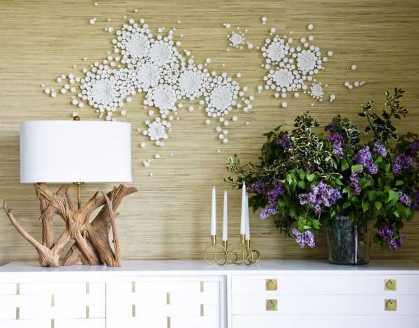 Кроме того, на имеющееся стеновое покрытие размещают различного размера и формы бамбуковые вставки, выстраивая фигуры, квадраты, прямоугольники, другие сложные фигуры.