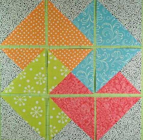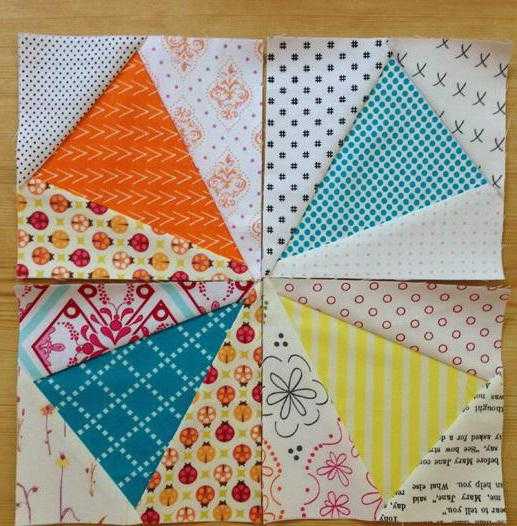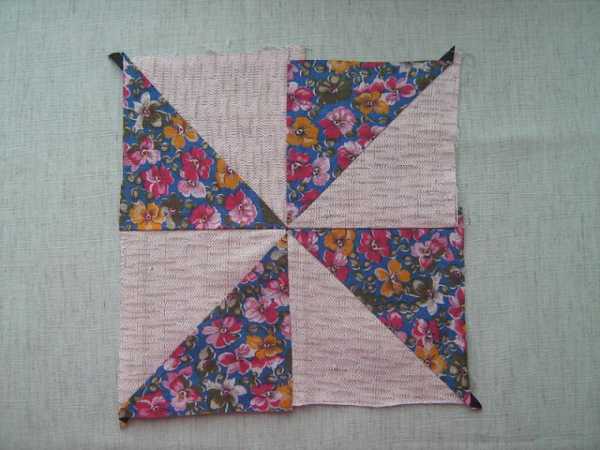 Все большие квадраты разрезать накрест по косой линии и сшить в треугольники узкой стороной так, чтобы слева всегда находился один и тот же цвет (например, желтый с белым). Их получится четыре, а две заготовки останутся из других цветов – из них собрать квадрат из 4-х треугольников, напоминающий бант.