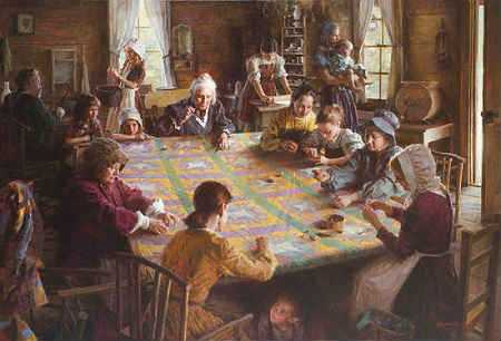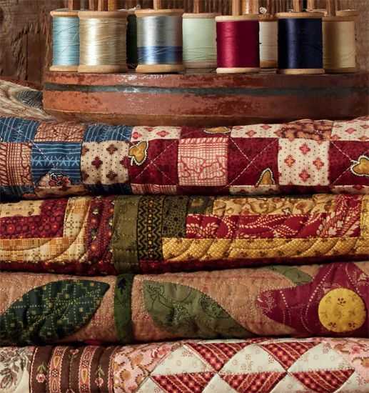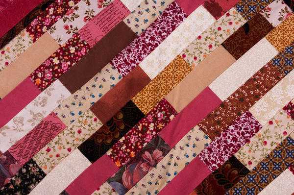 Повторное использование одних и тех же тканей в изделии позволяет расставить нужные акценты, за счет которых просчитывается нужная задумка. Традиционно красную ткань используют в центре работ в деревенско стиле. Яркие, пестрые ткани, продуманно расположенные среди однотонных лоскутков также создают превосходный рисунок. Текстурированные и узорные ткани. Лоскутное изделие, составленное из одинаковых по размеру лоскутов одного оттенка разной текстуры, создает неуловимый, но красивый эффект.