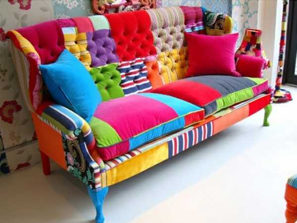 Выбрали гостиную? Хорошо! Дать вторую жизнь старому любимому креслу поможет накидка из больших ярких квадратов. Диван украсят покрывало и подушки. На окна вешаются все те же «цыганские шторы», а из остатков ткани «дачная рукодельница» может сделать небольшой коврик и положить его к дивану. Главное — не переборщить.