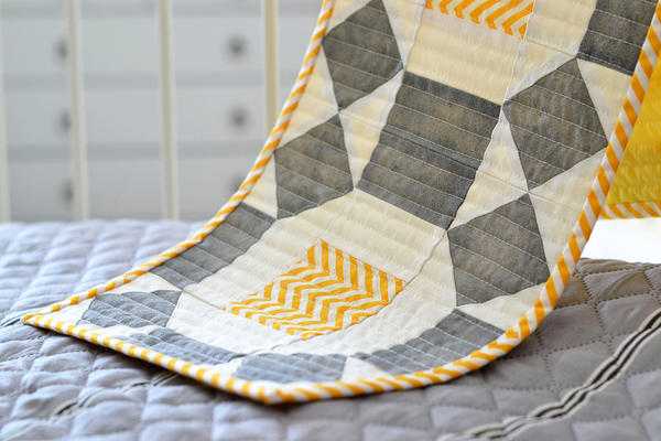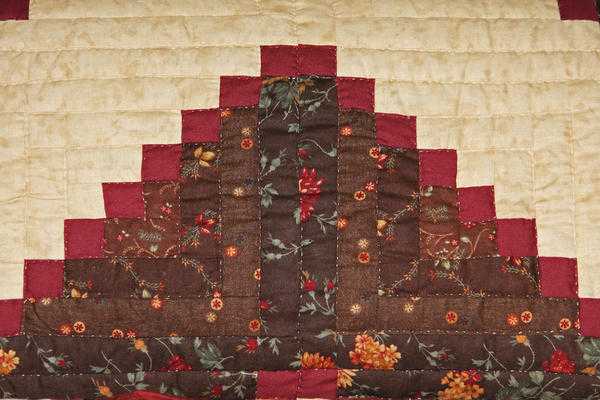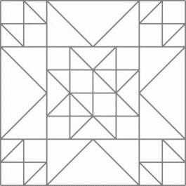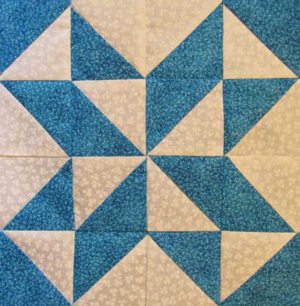 Одеяло в стиле пэчворк, изготовленное по такому шаблону выглядит очень эффектно: узор кажется трудоемким в исполнении, а на самом деле довольно прост: два отреза ткани контрастных цветов разрезаются на полосы и сшиваются по длине, складываются по шву и разрезаются на треугольники под углом 45 градусов (как чаще всего в лоскутном шитье). В итоге получатся квадратики, состоящие из двух треугольников, из которых собирается большой квадрат с определенным узором. В центр этого блока поместить квадрат из ткани третьего цвета.