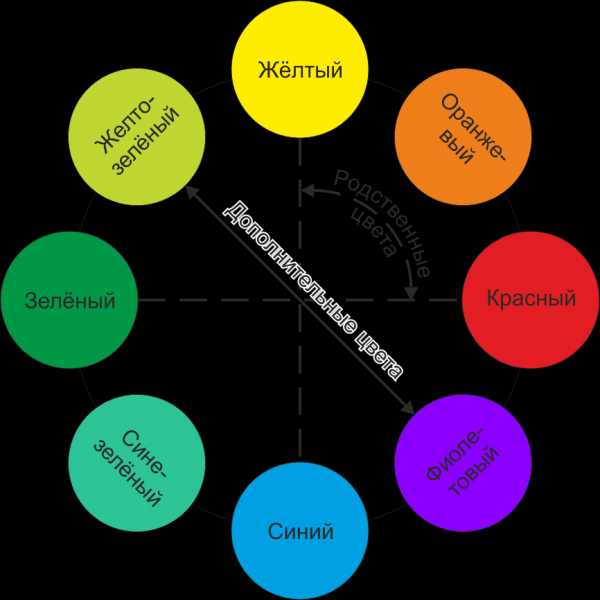 Все цвета условно можно разделить на две большие группы: родственные и дополнительные. К родственным цветам относятся близкие к друг другу цвета. В свою очередь к дополнительным — цвета, контрастирующие друг с другом. Наилучшим образом правила сочетания цветов можно представить в виде несложной схемы. Такой упрощенный цветовой круг наглядно демонстрирует какие цвета являются дополнительными, располагая их друг напротив друга. Цвета, образующие на данной схеме сектора, отделенные пунктиром, будут относиться к родственным.