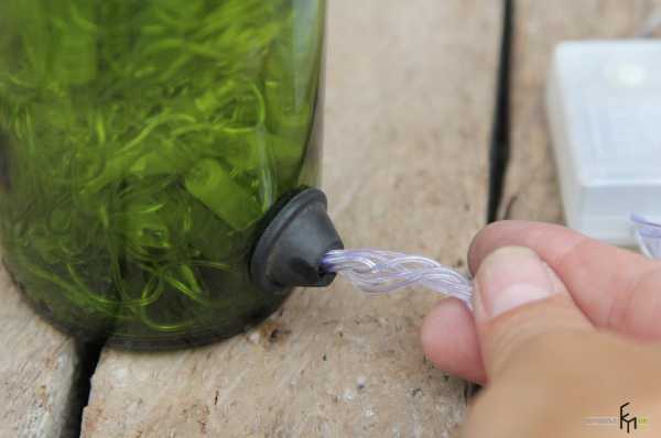 Лампочки гирлянды по одной опускают в бутылку через отверстие, оставляя необходимую часть провода с вилкой. Светильник предполагается ориентировать вертикально горлышком вверх.