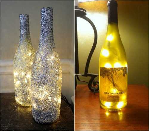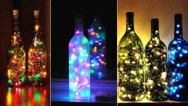 Лампа из стеклянных бутылокИз стеклянных бутылок можно сделать и отличную гирлянду к новогодним праздникам.