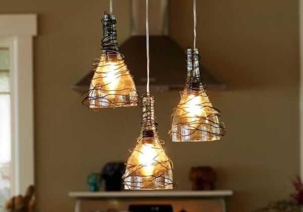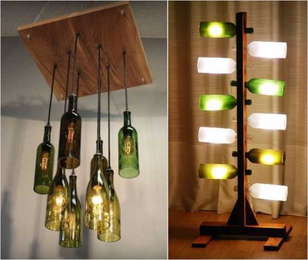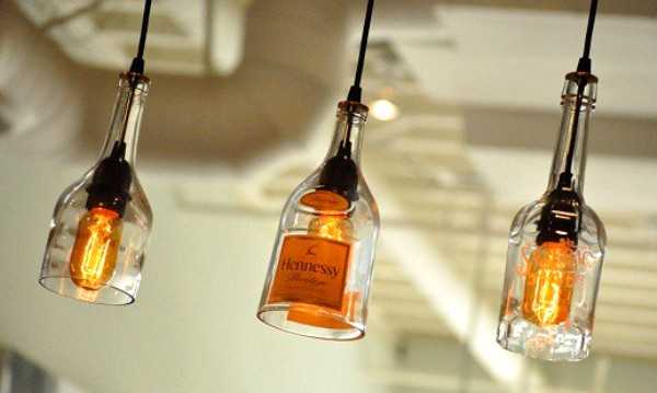 Подсвечники из стеклянных бутылокОчень интересно смотрятся различные люстры и светильники из пустых стеклянных бутылок. Такие светильники могут украсить как интерьер в деревенском стиле, так в современных стилях, таких как хай-тек или модерн. На кухне или в столовой стильно будет смотреться многоярусная люстра, а стены коридора или прихожей украсят небольшие бра.