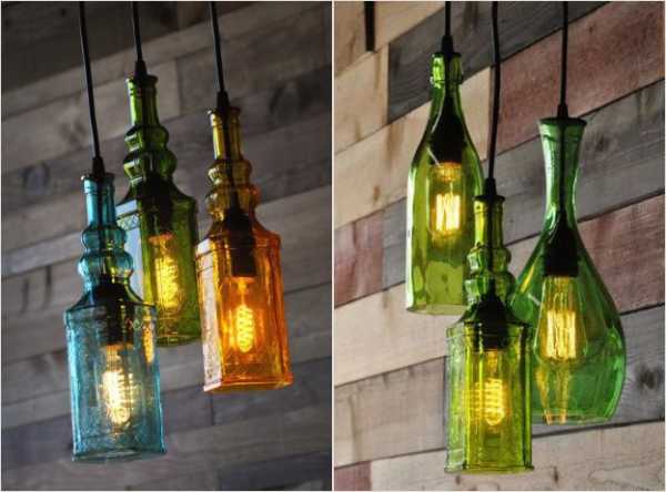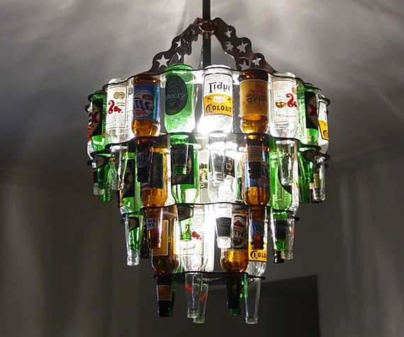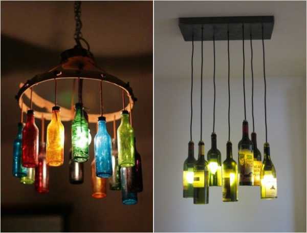 Очень интересно и необычно смотрятся люстры из разноцветных стеклянных бутылок из-под лимонада или пива. В общем направлений для полета фантазии великое множество.