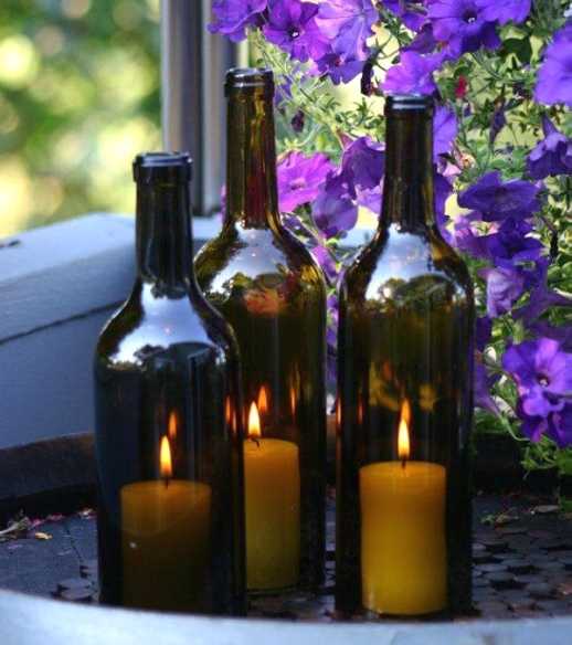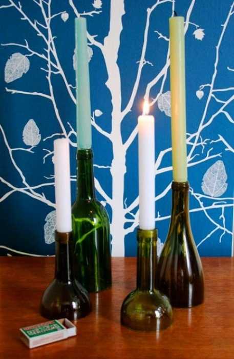 Из стеклянных бутылок темных оттенков без особого труда можно сделать оригинальные подсвечники. Для этого необходимо у стеклянных бутылок с высоким горлышком отрезать донышко, обработать основание светильника шлифовальной машинкой, а в горлышке закрепить свечки.