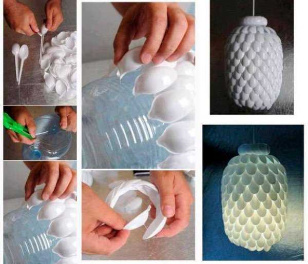 Для данного варианта используем 5-литровую бутылку и много одноразовых пластиковых ложек. Дно емкости нужно отрезать. У ложек отрезаем ручки и приклеиваем термоклеем к поверхности бутылки по кругу так, чтобы каждый последующий ряд немного заходил на предыдущий. Чтобы закрыть горлышко, нужно сделать «ободок» из склеенных в кольцо ложек. Далее закрепляем патрон и лампочку, как описано выше.