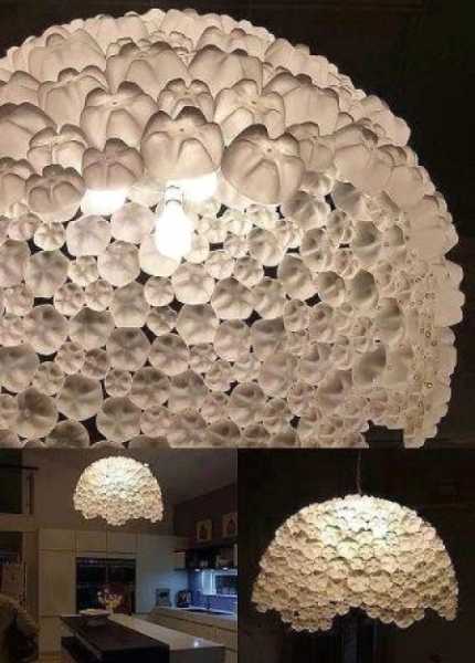 Белые пластиковые бутылки с выступающим дном из-под кефира и других кисломолочных напитков тоже можно использовать. В этом случае срезаем дно с невысокими краями. Элементы соединяем между собой с помощью клея форме чаши, располагая сверху элементы большего диаметра, а ближе к свисающим краям чаши — меньшего. Для крепления патрона и провода используем уже описанную методику с применением верхней части тары.